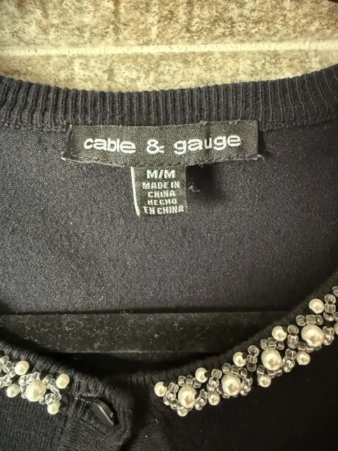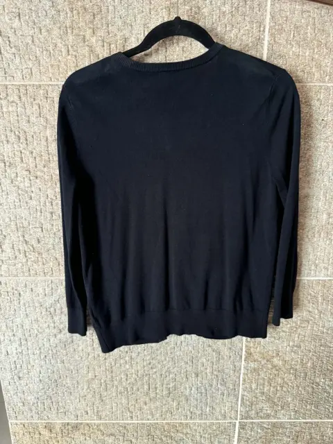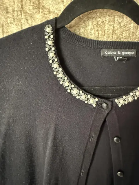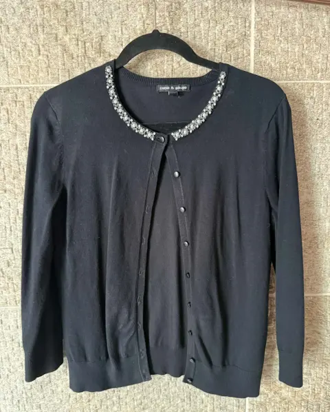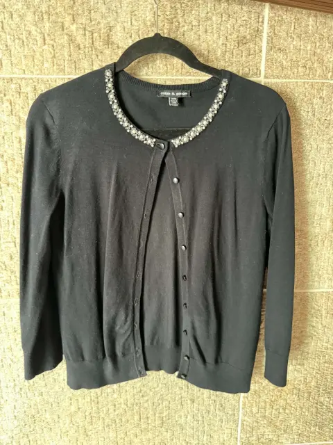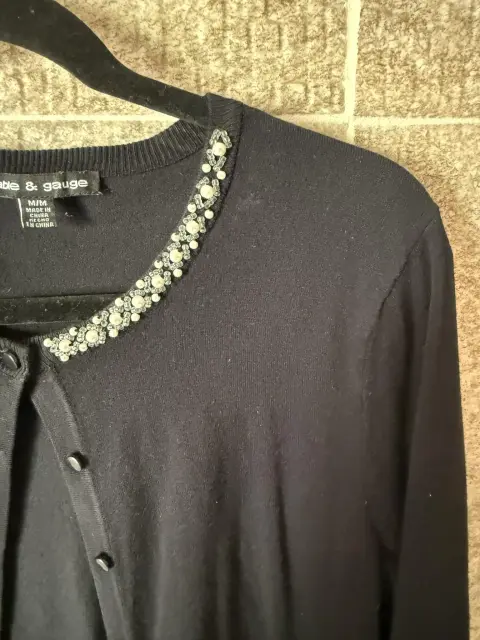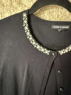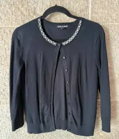 Hermoso suéter color negro con detalles bordados y pedrería plateada en el cuello que le dan un toque elegante y femenino cuenta con botones al frente y manga larga perfecto para combinar con jeans o faldas y usar en ocasiones casuales o semi formales, en excelente estado sin detalles