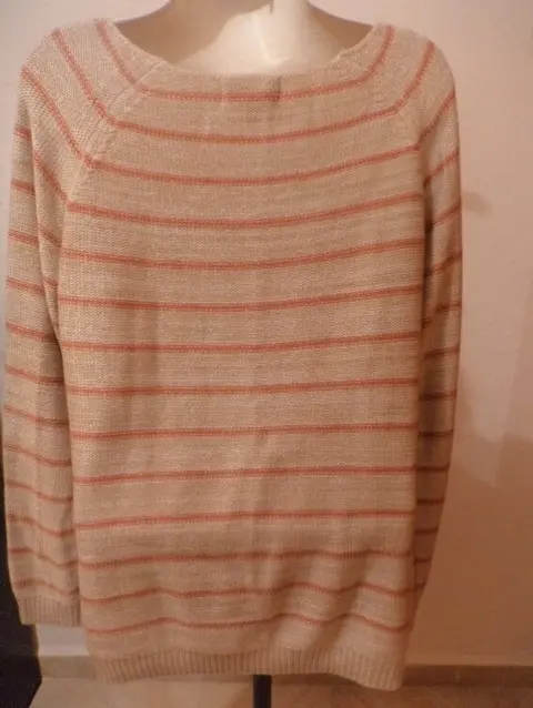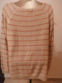 Suéter rayado en color beige y rayas terracota de la marca Pink.Rose, viene marcado como XL pero está algo reducido.Medidas:Ancho axila a axila 51 cms,Largo espalda 66 cms,Largo manga desde axila 46EN EXCELENTES CONDICIONES YA QUE SÓLO TUVO UNA PUESTA