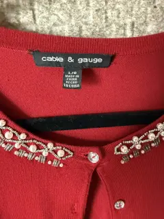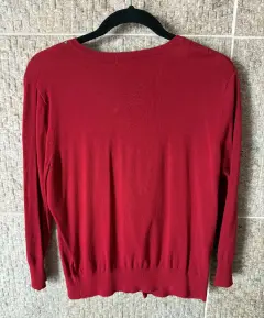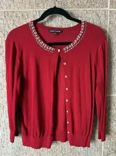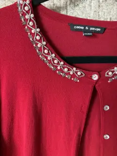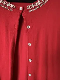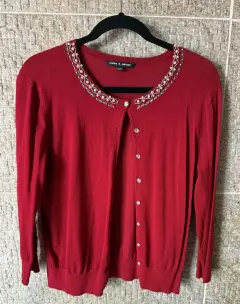 Hermoso suéter color rojo con detalles guardados y pedrería plateada en el cuello que le dan un toque elegante y femenino cuenta con botones al frente y manga larga perfecto para combinar con jeans o faldas y usar en ocasiones casuales o semi formales en excelente estado sin detalles