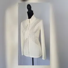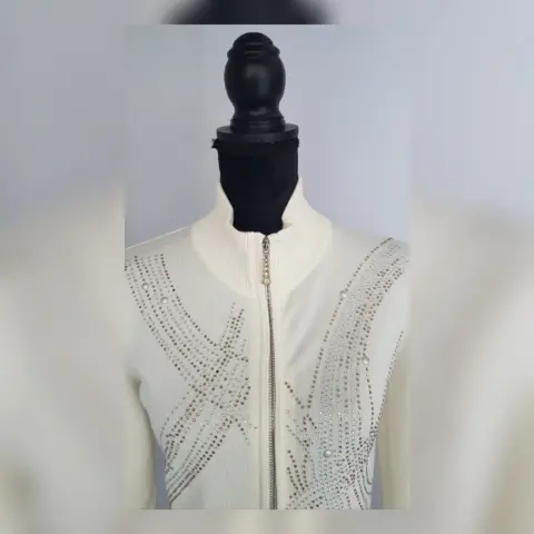 Suéter Tejido de Punto c/Aplique Bisutería. Cardigan en tejido de punto tono MARFIL, cuello Perkins, cierre p/cremallera, aplique bisutería TRANSLÚCIDA/PLATEADA/DORADA en zona frontal. Talla M (Da a M/L). Dimensiones cms: 38 hombro, 45 axila, 42 cintura, 49 zona baja, 62 largo, 63 largo manga. 73% viscosa, 27% nylon. Para lavado en casa.***EL TONO EXACTO ESTÁ EN LA FOTO NÚM 5******EL BRILLO DEL APLIQUE DE BISUTERÍA ES MUY BELLO Y NO LO CAPTA LA FOTOGRAFÍA***