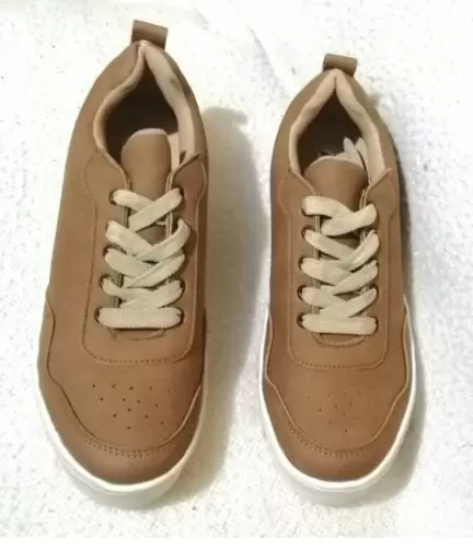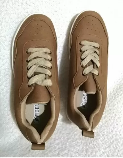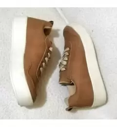 Tenis Moderno color camel de agujetas, diseño liso que da apariencia de gamuza rugosa aunque el material es textil tipo piel resiente a agua. Suela es Ligera gruesa de 3cm estilo casual urbano. Número Méxicano #24cm.Pregúntame o Visita mi clóset para más modelos o numeración. Si es tu primer compra en la App usa mi descuento de -$100 copiando código promocional:lucyrmxXqQJ9