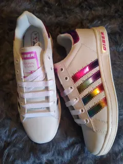 Tenis de mujer.Color blanco y líneas color unicornio 🦄 Talla 25Suela sintética Nuevos