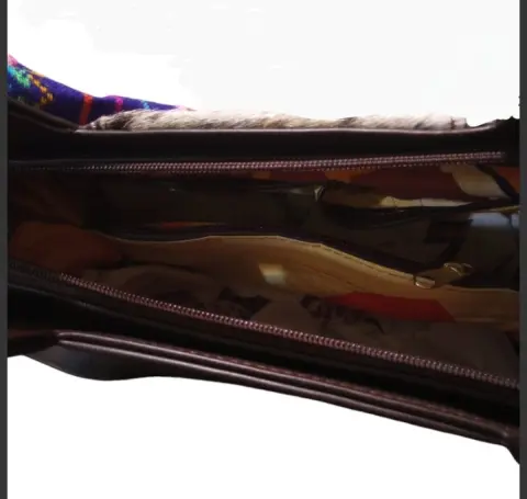 Bolsa de piel con franja de pelo en el centro, tiene compartimentos por dentro y correa para cross body.Medidas 30*14*31 cm