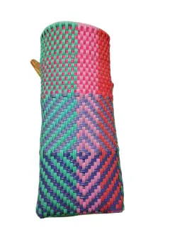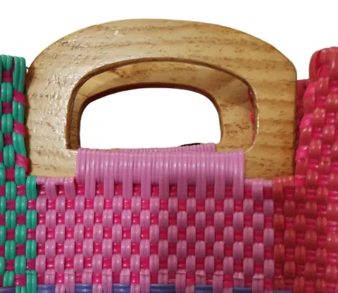 Bolso artesanal fabricado con tiras de plástico, tejido a mano.Dimensiones. 35*25*15 cm (largo/alto/ancho)Técnica de tejido. Cestería Material. Tiras de polietileno y asa de madera