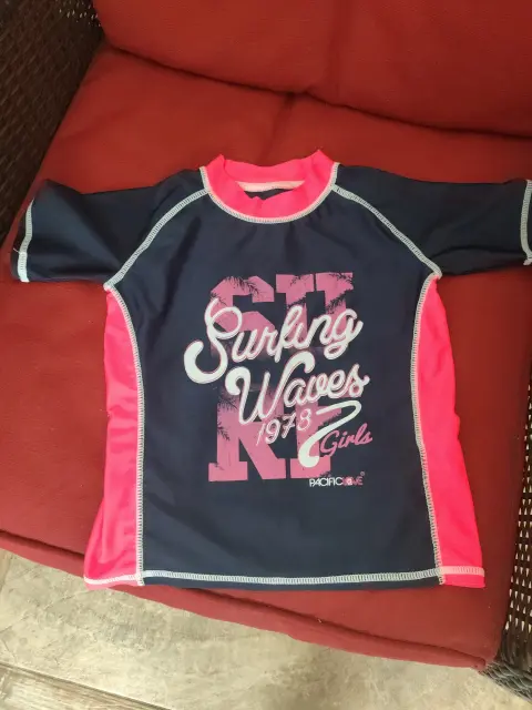 Playera para nado con protector solar. Playera manga corta color azul/rosa unisex para niños. Talla 4. Excelente material para proteger de los rayos uv a los peques
