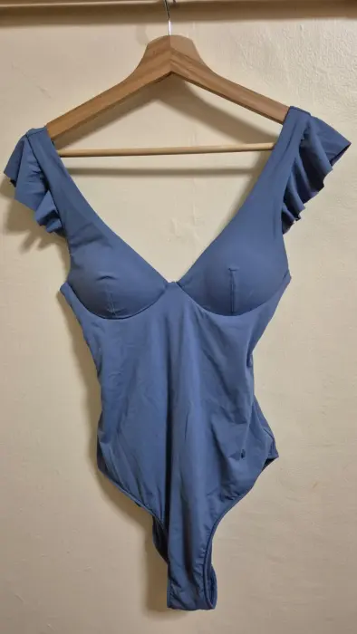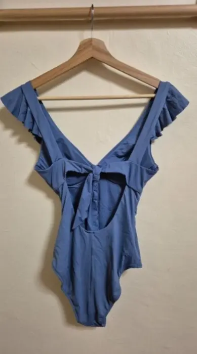 Traje de baño moldeador con volantes decorativos en escote. Copa extraible. Espalda escote con lazos ajustables. Corte pierna medio. 83% poliamida 17% elastano. Perfectas condiciones
