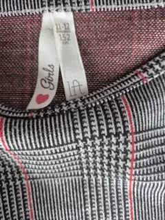 Vestido de niña con diseño de cuadros en tonos grises, manga larga y corte con falda amplia que da movimiento y comodidad. Tela suave y ligera, ideal para uso diario, escuela o eventos casuales. En muy buenas condiciones.