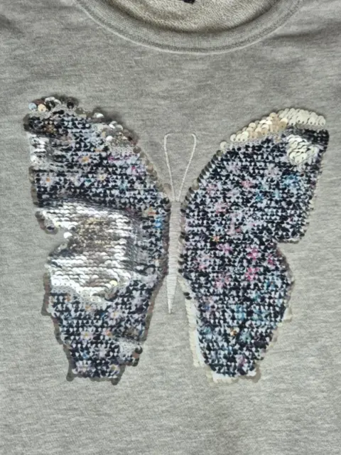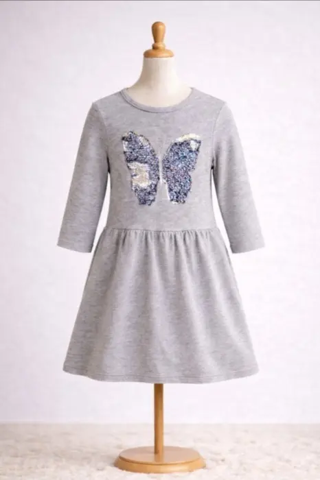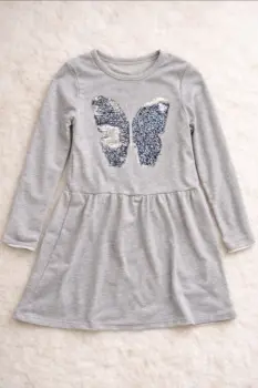 Hermoso vestido para niña, gris con lentejuelas, muy cómodo y fresco!! La mariposa es reversible y cambia de color