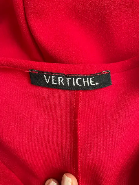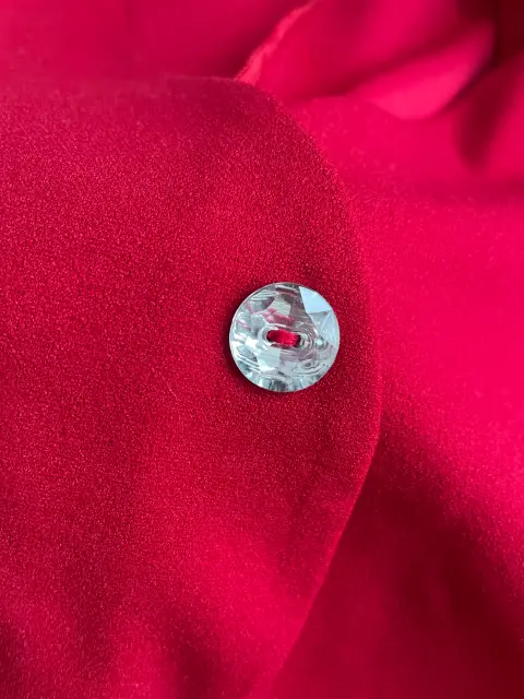 Bonito vestido rojo, manga corta, escote en V, con cinta para ajustarlo al cuerpo, botones en aspecto plata. Marca: Vertiche Talla: S Largo: 90cm