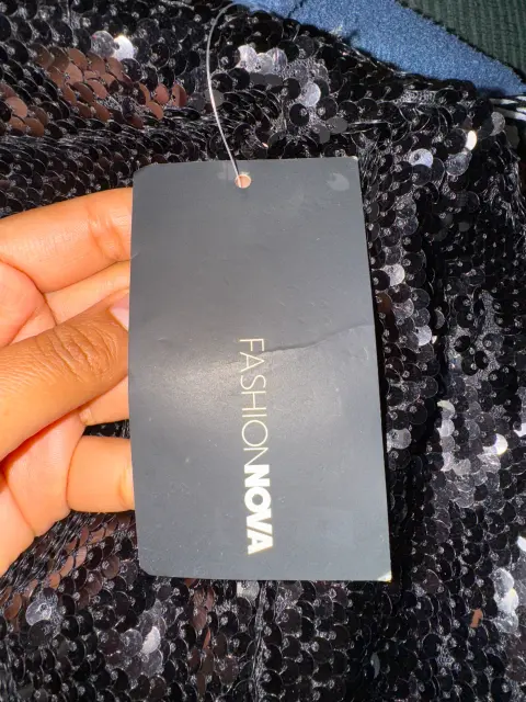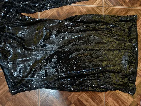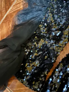 Excelente vestido para lucir tu belleza. Vestido negro de lentejuelas con una manga larga cuál tiene un tul que te le da un toque de elegancia increíble es de talla L y marca Fashionnova