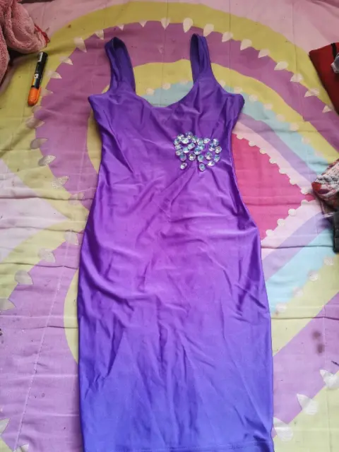 Lila. Vestido con hermoso detalle de pedrería en zona arreglada por un rasgado