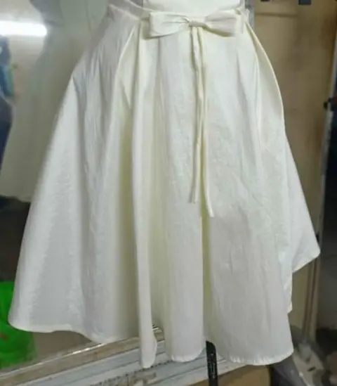 De satin.. Con un poco de crinolina para que esponje poquito, justo a la medida. Tela stretch.. Color beige