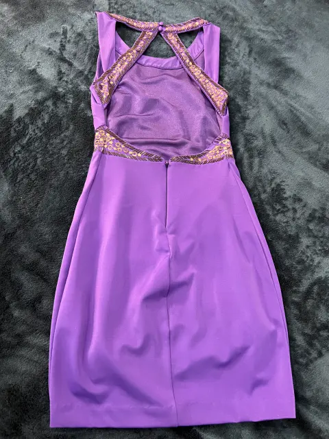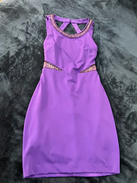 Hermoso y sexy a la vez, mini vestido pegadito color morado con detalle de pedrería. Muy poco uso, excelentes condiciones, la tela es muy suave y brillante.