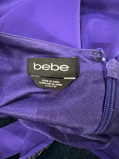 Mini vestido BEBE. Hermoso y sexy a la vez, mini vestido pegadito color morado con detalle de pedrería. Muy poco uso, excelentes condiciones, la tela es muy suave y brillante.