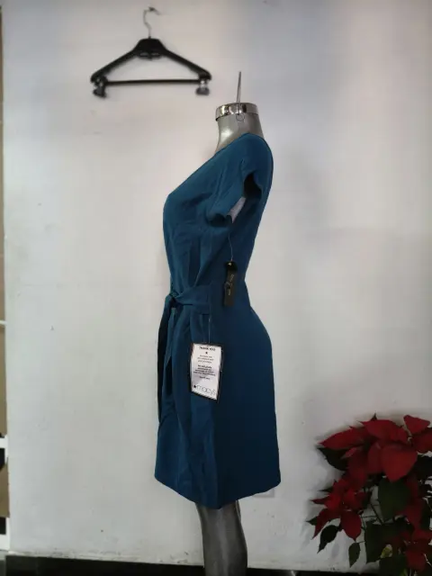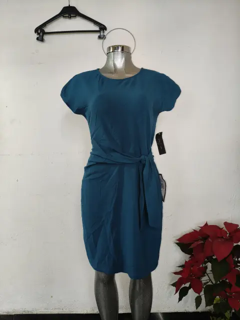 con nudo lateral en color azul. El diseño presenta un cuello redondo, mangas cortas tipo casquillo y un detalle fruncido en la cintura con un lazo lateral que ayuda a crear una silueta favorecedora.