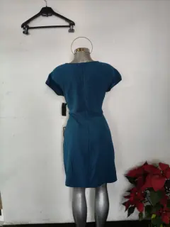 mini vestido body. con nudo lateral en color azul. El diseño presenta un cuello redondo, mangas cortas tipo casquillo y un detalle fruncido en la cintura con un lazo lateral que ayuda a crear una silueta favorecedora.