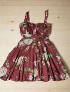 Vestido floral corte A, ajustado en la parte superior y con una falda acampanada que le da volumen. El color base es un tono burdeos adornado con un estampado que incluye flores grandes. El escote incluye almohadillas delgadas para dar más forma al pecho. La parte trasera tiene cierre y un detalle de lazo lo que permite ajustar la prenda y añade un elemento decorativo. Ideal para eventos diurnos semi formales.**Solo se usó una vez**