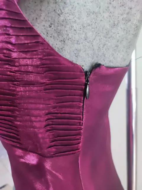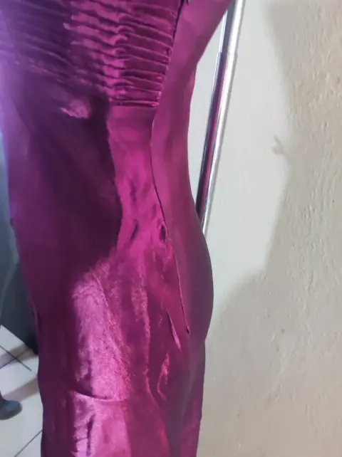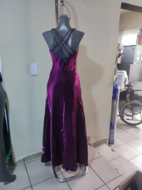 Vestida de fiesta púrpura largo. Vestido de fiesta largo de tirantes con cierre al lado tiene forro talla s buenas condiciones una está listo para usarse