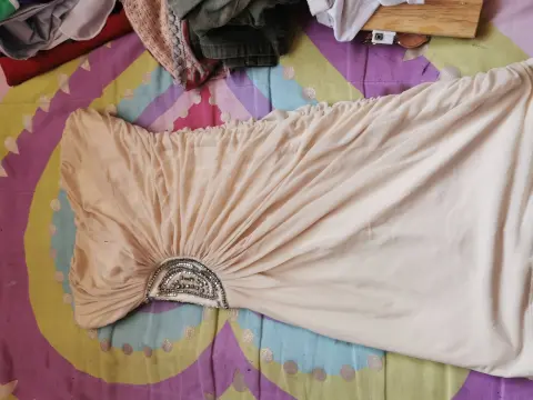 Vestido. Le falta pedrería no afecta el uso, tiene buen color y cinta en el pecho para evitar se baje