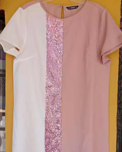 Vestido. Vestido con pequeñas lentejuelasLo pedí en SheIn pero me equivoqué de tallaEs tres colores al frente y por detrás todo rosaTela fresca, es un poco transparente.
