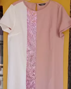 Vestido con pequeñas lentejuelasLo pedí en SheIn pero me equivoqué de tallaEs tres colores al frente y por detrás todo rosaTela fresca, es un poco transparente.