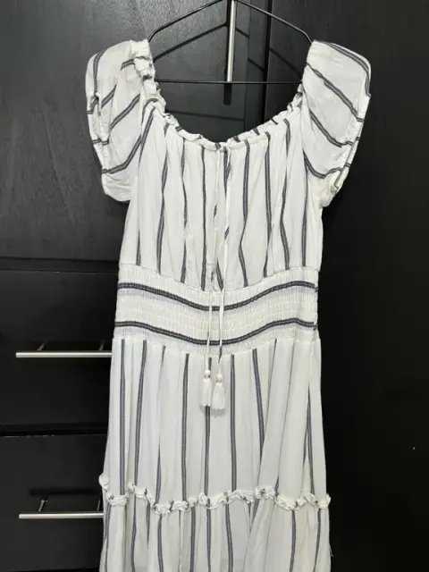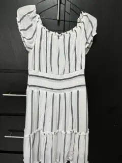 ¡Un clásico de American Eagle! 🦅Vestido midi estilo bohemio, súper fresco y femenino.• Fit Perfecto: Cintura elástica tipo "nido de abeja" que se adapta a tu cuerpo.• Versátil: Úsalo normal o off-the-shoulder. Incluye borlas decorativas.• Calidad AE: Tela de excelente caída, con forro interior (no transparenta).Talla mediana
