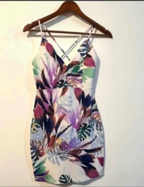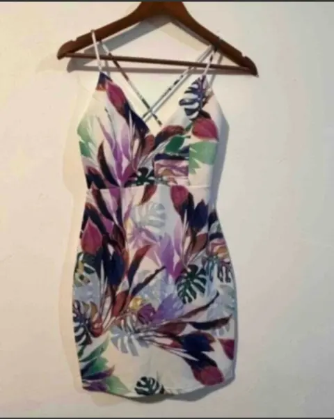 Vestido beige claro con flores. Hermoso vestido color beige claro con flores , Talla : 1 Marca Shoho Escote cruzado en la espalda , tela semi strech