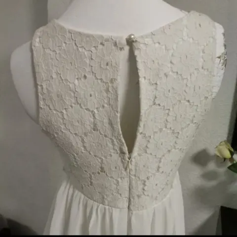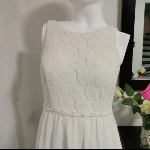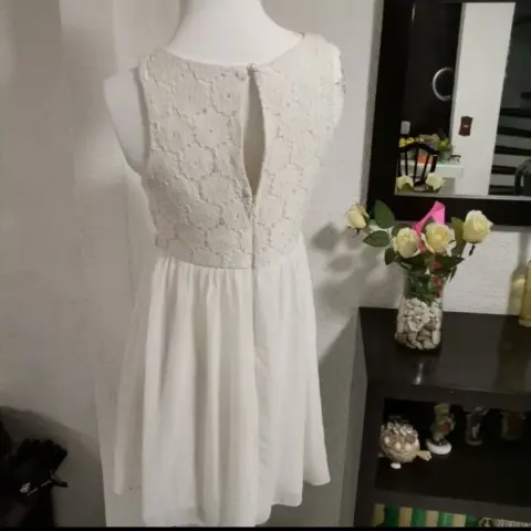 Vestido estilo romántico blanco talla 9 pero biene reducido queda más a talla 7 CHECA LAS MEDIDAS en perfecto estado sin ningún detalle sus medidas son de axila a axila 41 cm largo 86 cm cintura 37 cm..