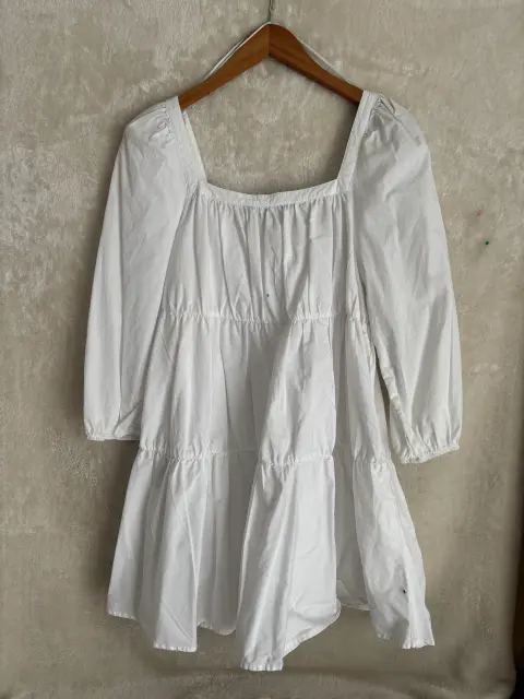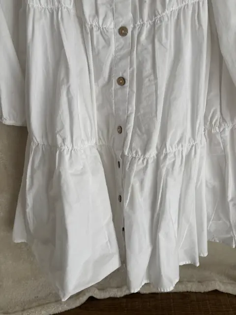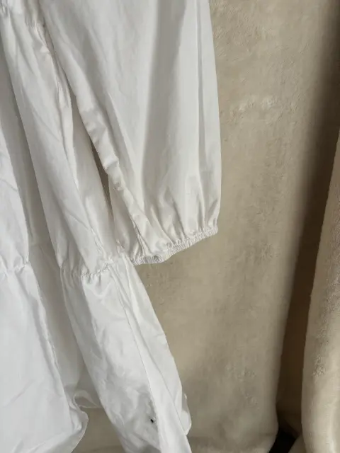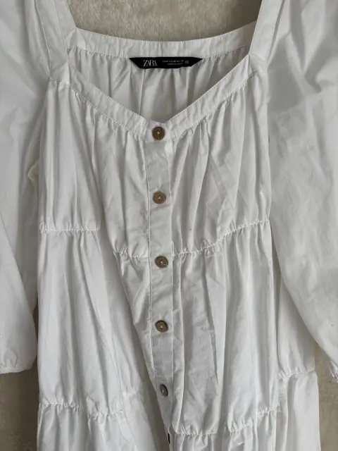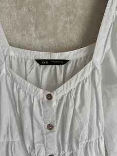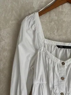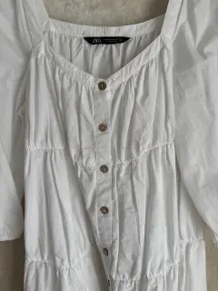 Vestido blanco Zara. Color blanco Talla LMaterial algodón DescripciónVestido corte holgado tipo holanes , color base blanco, mangas 3/4,con resorte al final , cuello cuadrado, tres botones Estado Usado una vez Precio 400 Medidas en centímetros Ancho hombros 36 cmCuello cuadrado24 cm Escote medio 20 cm Busto 49cmLargo 81 cm Mangas 3/4 51 cm con resorte al final Sin Cintura marcada