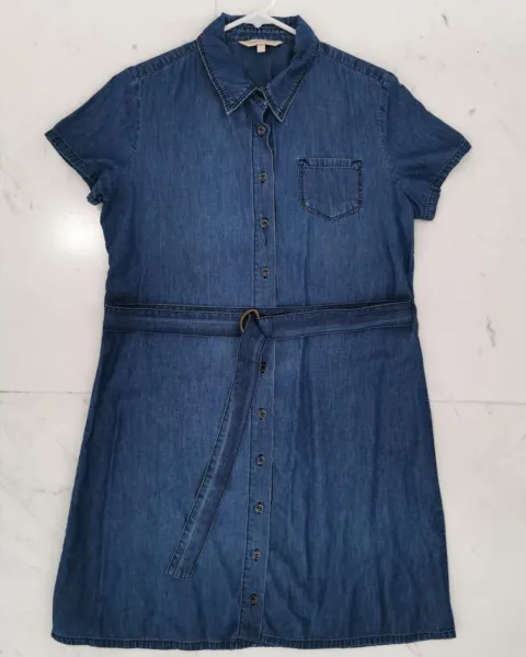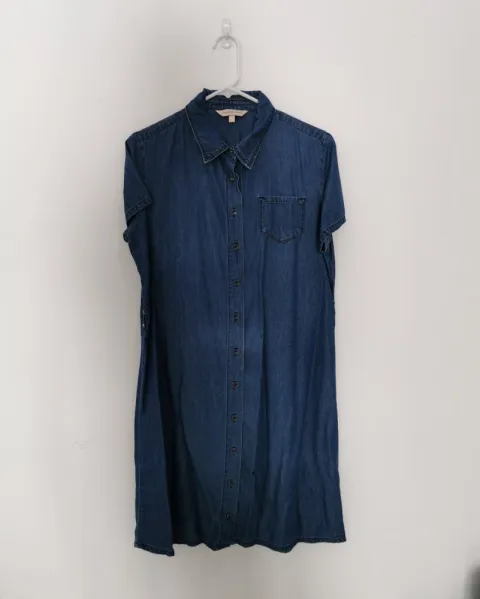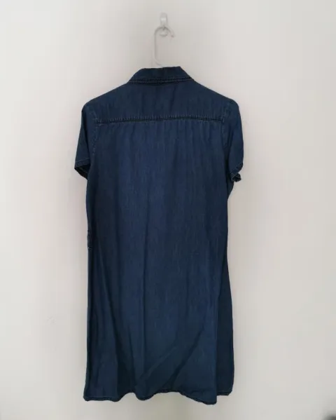 Vestido estilo camisa de mezclilla, tiene un bolsillo de parche pecho. Mangas cortas. Botones al frente. Talla S.