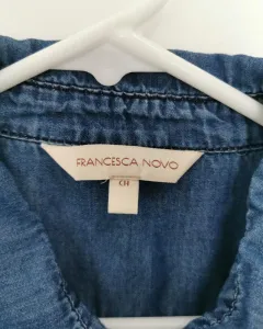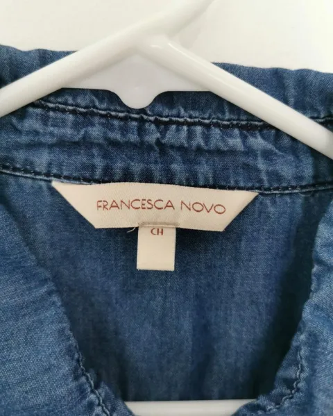 Vestido camisero de mezclilla Francesca Novo. Vestido estilo camisa de mezclilla, tiene un bolsillo de parche pecho. Mangas cortas. Botones al frente. Talla S.