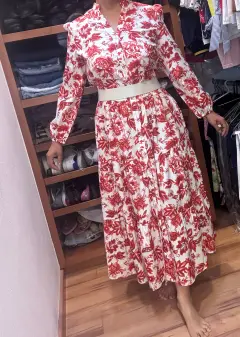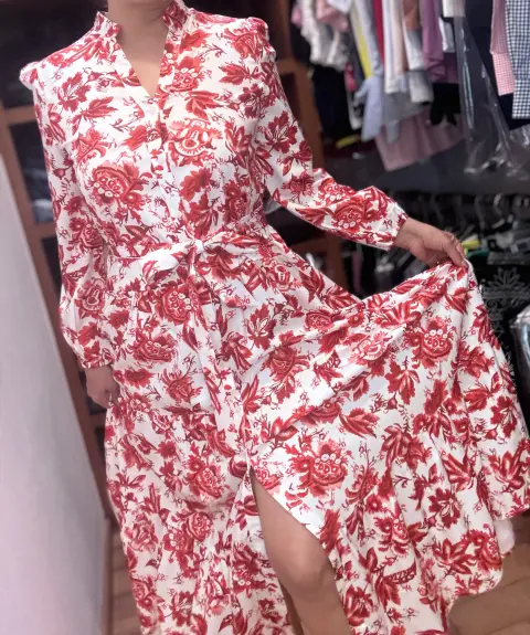 Vestido camisero flores rojas. Vestido talla mediana flanco con flores rojas Solo se usó una ves Esta en perfectas condiciones