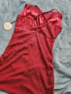Vestido coctel rojo. Nuevo con etiqueta: Vestido corto con brillos sin ningún detalle; tiene forro, es semi abierto de un lado lo que hace realzar la figura, nunca se usó.