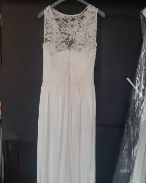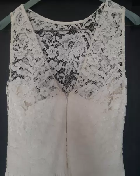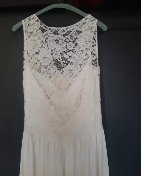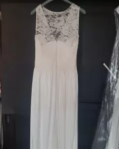 Vestido largo color hueso, con aplicaciones en el pecho de encaje... Discreto escote en la espaldaEl detalle de la flor en la cintura es removible