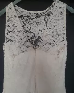 Vestido con flor. Vestido largo color hueso, con aplicaciones en el pecho de encaje... Discreto escote en la espaldaEl detalle de la flor en la cintura es removible