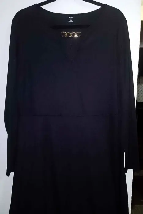 Vestido negro de manga larga de tela elástica acanalada con motivo de cadena en el cuello, largo 97cm, 108 cm pecho, 95 cm cintura, 144 cm caderaAcepto ofertasEnvío a la brevedad