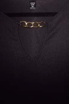 Vestido con motivo cadena dorada. Vestido negro de manga larga de tela elástica acanalada con motivo de cadena en el cuello, largo 97cm, 108 cm pecho, 95 cm cintura, 144 cm caderaAcepto ofertasEnvío a la brevedad
