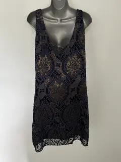 Bonito vestido azul con dorado, cierre en un costado Medidas aproximadas De axila a axila 46 cm Largo 91 cm