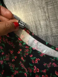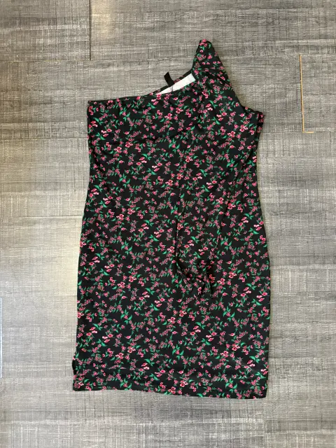 Vestido corto casual. Vestido de flores Muy fresco Con una manga y otra descubierta Talla EG/XG Suavecito 46 cm de axila a axila 92 cm de largo Negro con color rojo de las flores y verde Está muy lindo