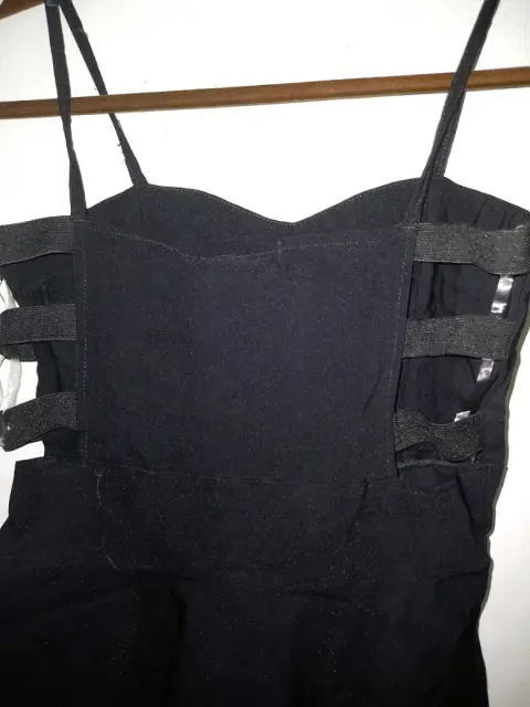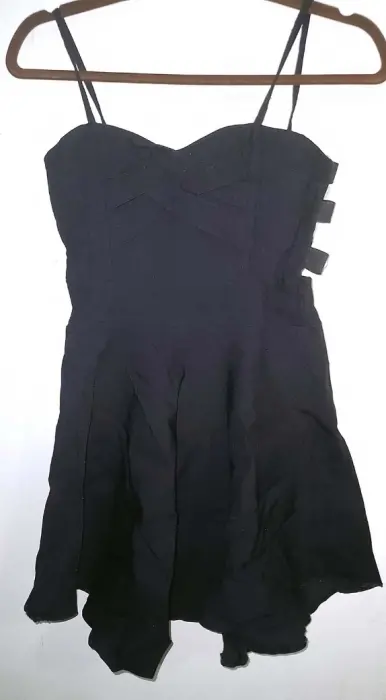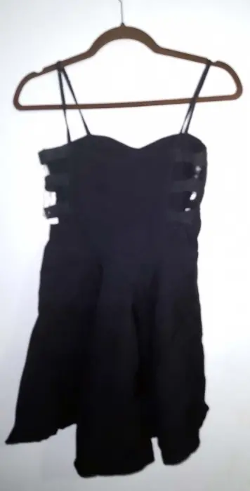 Vestido de gabardina elástica brillante negra, con calado a los costados y falda circular 36 cm de axila a axila, 60 cintura, 56 cm largo.Envío a la brevedadTodas las compras incluyen obsequio