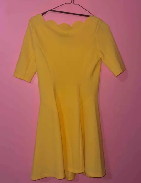 Vestido corto color amarillo. Vestido corto color amarillo, con detalles de curvas en el escote, de corte circular. Perfecto para una fiesta o para la oficina. No se transparenta. Completamente nuevo, con etiqueta.