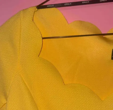 Vestido corto color amarillo, con detalles de curvas en el escote, de corte circular. Perfecto para una fiesta o para la oficina. No se transparenta. Completamente nuevo, con etiqueta.
