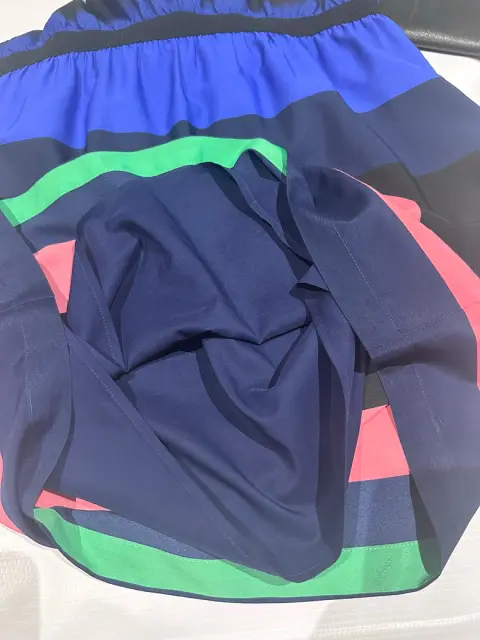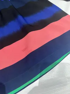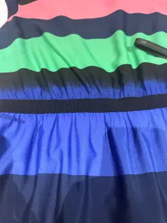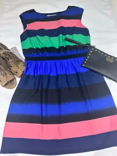 Vestido corto con rayas. REESTRENA!! Vestido hermoso para esta temporada, por sus colores se ve con sandalias en diferentes tonalidades. Muy combinable. Tiene una pequeña mancha de aceite ultima foto.Medidas:Hombro 47 cmCintura 38 cm con poco resorteLargo 83 cm