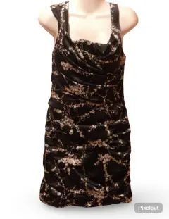 Vestido corto Express. Hermoso vestido negro con estampado en flores, diseño en pliegues, escote cuadrado al frente y en "v" en la espalda, perfecto para un cóctel o fiesta en jardínTalla 6 con las siguientes medidas:Ancho axila 43 cmsLargo desde axila (65 cms)PRENDA EN EXCELENTES CONDICIONES YA QUE SÓLO TUVO UNA PUESTA