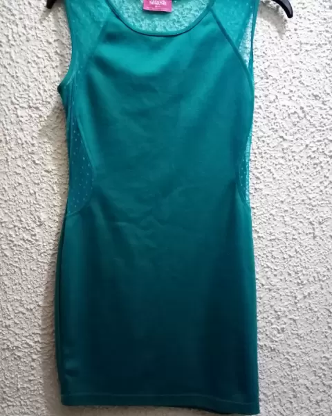 Vestido corto sin manga. Vestido corto color verde con malla en hombros y los costados trae cierre en la parte de atrás, tela 93% poniente 3% elástico.