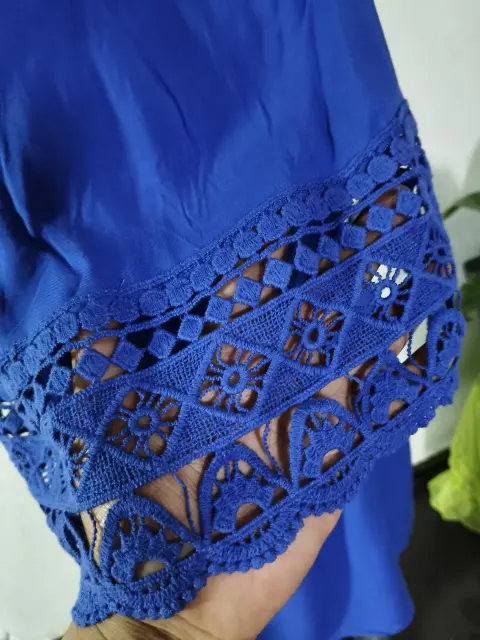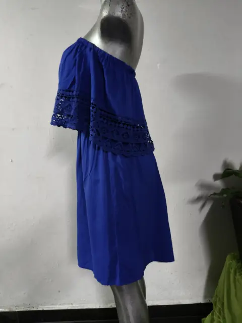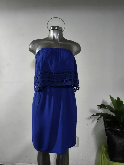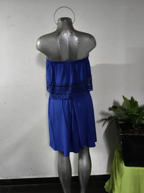 vestido corto strapless. vestido corto strapless en un tono azul vibrante.volante superior presenta un acabado de encaje bordado o ganchillo (crochet