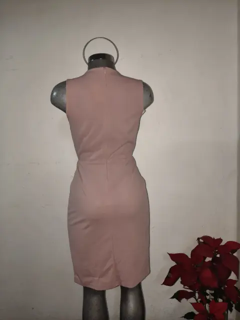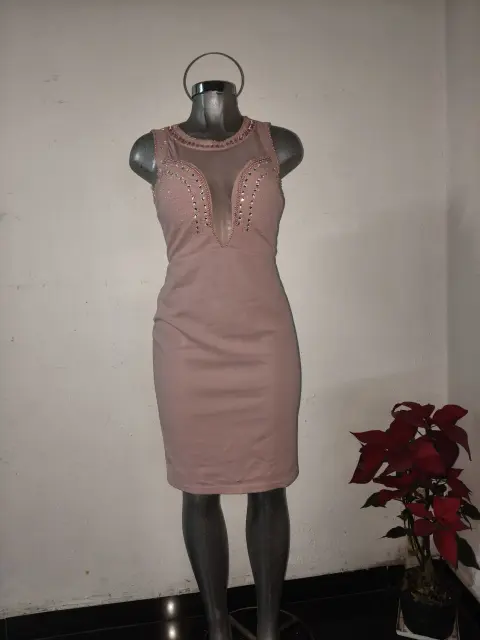 vestido corto y ajustado,. Cuenta con detalles de pedrería o cuentas aplicadas en el cuello y en el escote en V de malla transparente en la parte delantera, lo que le da un toque elegante y brillante.