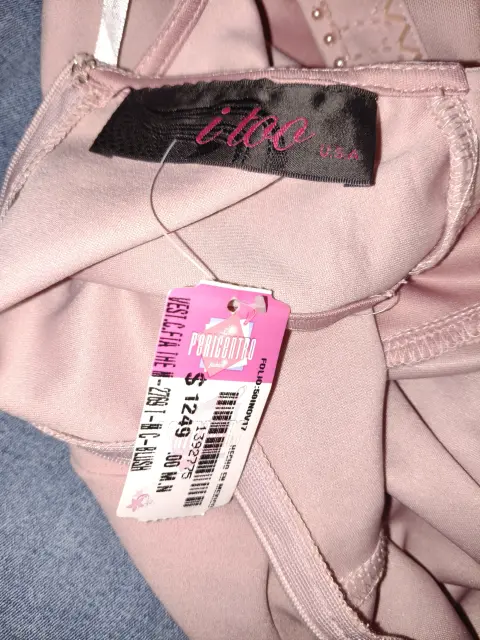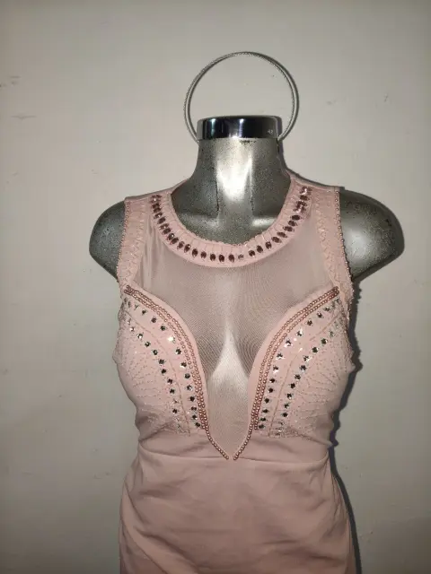 Cuenta con detalles de pedrería o cuentas aplicadas en el cuello y en el escote en V de malla transparente en la parte delantera, lo que le da un toque elegante y brillante.