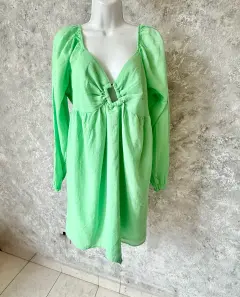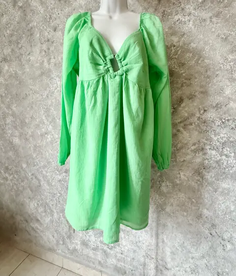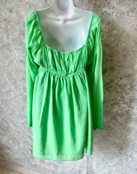 Vestido curvy imperio American Eagle. Vestido curvy corte imperio vibrante de American Eagle. Algodón ligero y fresco, escote profundo con fruncido central y detalle circular tipo aro, que acentúa la figura con un toque moderno y coqueto. Las mangas largas con ligero globo y el elástico en la espalda garantizan un ajuste cómodo. Ideal para días soleados, tardes de brunch o escapadas casuales con estilo.