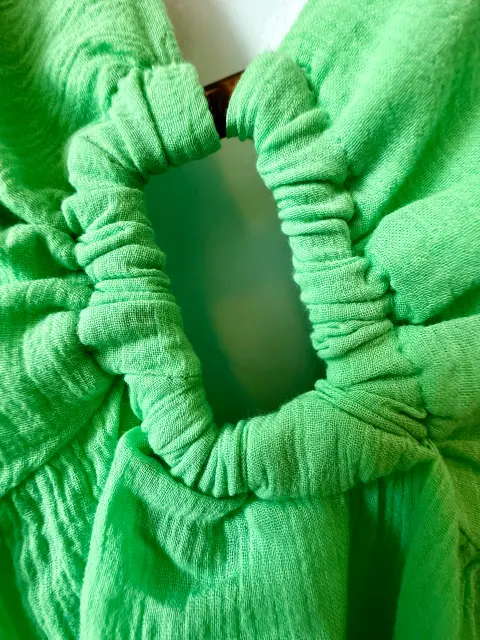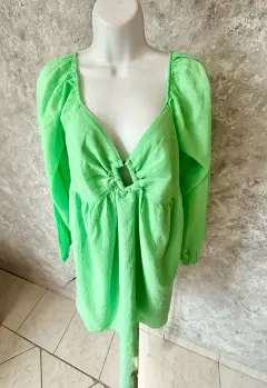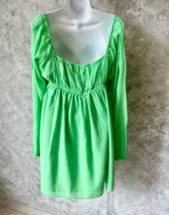 Vestido curvy corte imperio vibrante de American Eagle. Algodón ligero y fresco, escote profundo con fruncido central y detalle circular tipo aro, que acentúa la figura con un toque moderno y coqueto. Las mangas largas con ligero globo y el elástico en la espalda garantizan un ajuste cómodo. Ideal para días soleados, tardes de brunch o escapadas casuales con estilo.